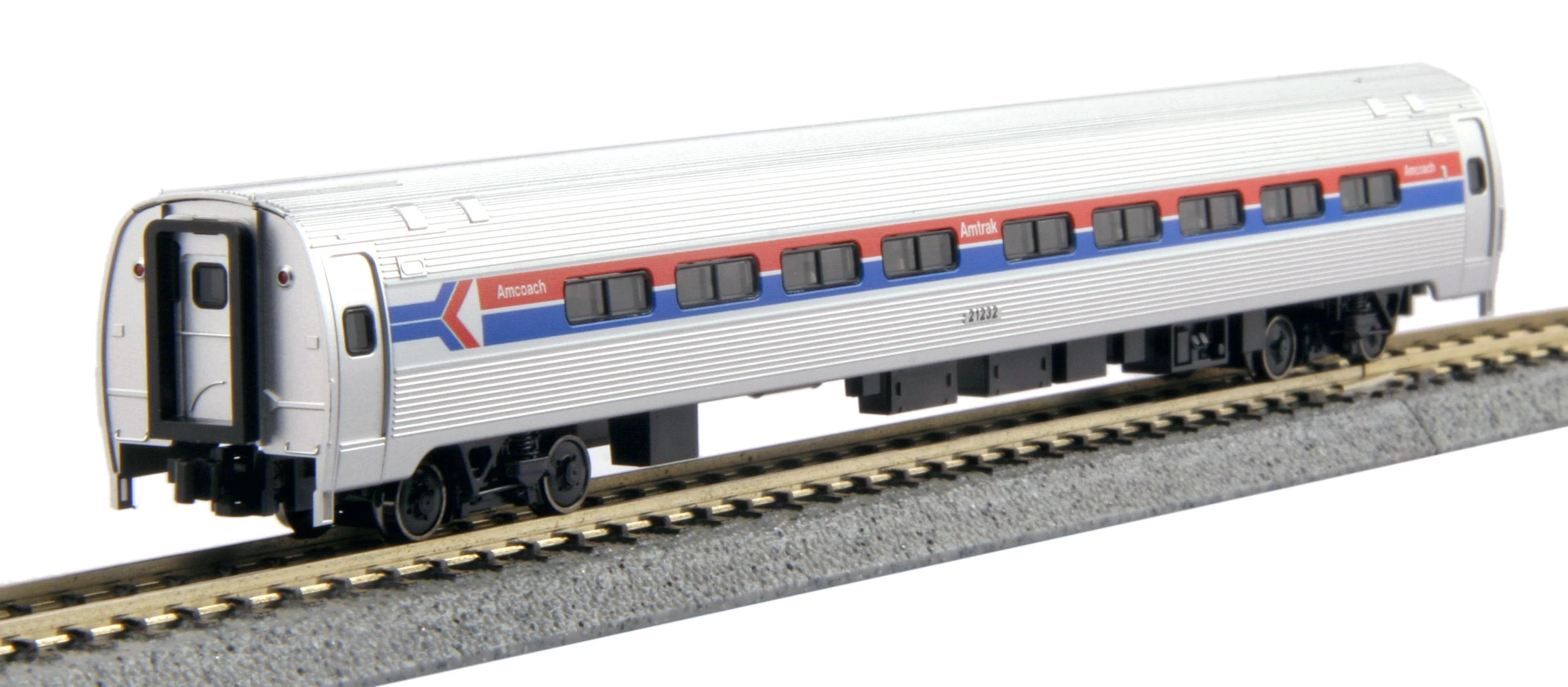 During its beginnings, Amtrak inherited its passenger cars from other railroads. Old, steam heated and in dire need of upgrades, Amtrak set out to replace these cars in 1973 with the purchase of the first Amfleet cars from Budd. This initial batch of 492 cars were the Amfleet I – with a door and vestibule on either end (unlike their single-doored successor), these cars fell into a few different varieties but essentially broke down into coach and dinette variants. These cars with their Phase I colors are ideal for pairing up with your new Phase I or Phase II SDP40F or with Katoβs still-available Amtrak GG1 (available in two road numbers!).