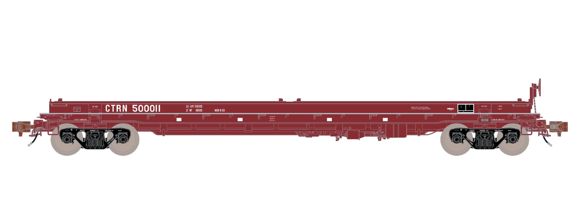 - Highly-detailed Barber S-2 100-ton trucks with finely rendered raised foundry data, rotating bearing caps, side bearing detail, and separate brake beam detail