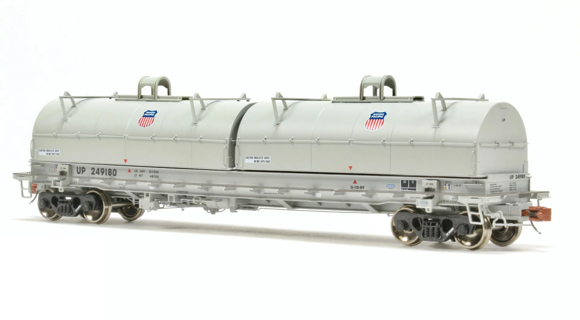 - Highly-detailed Barber S-2 100-ton trucks with finely rendered raised foundry data, rotating bearing caps, side bearing detail, and separate brake beam detail