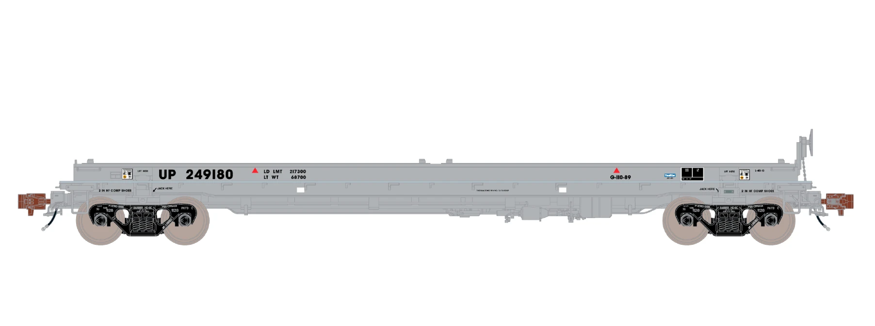 - Highly-detailed Barber S-2 100-ton trucks with finely rendered raised foundry data, rotating bearing caps, side bearing detail, and separate brake beam detail