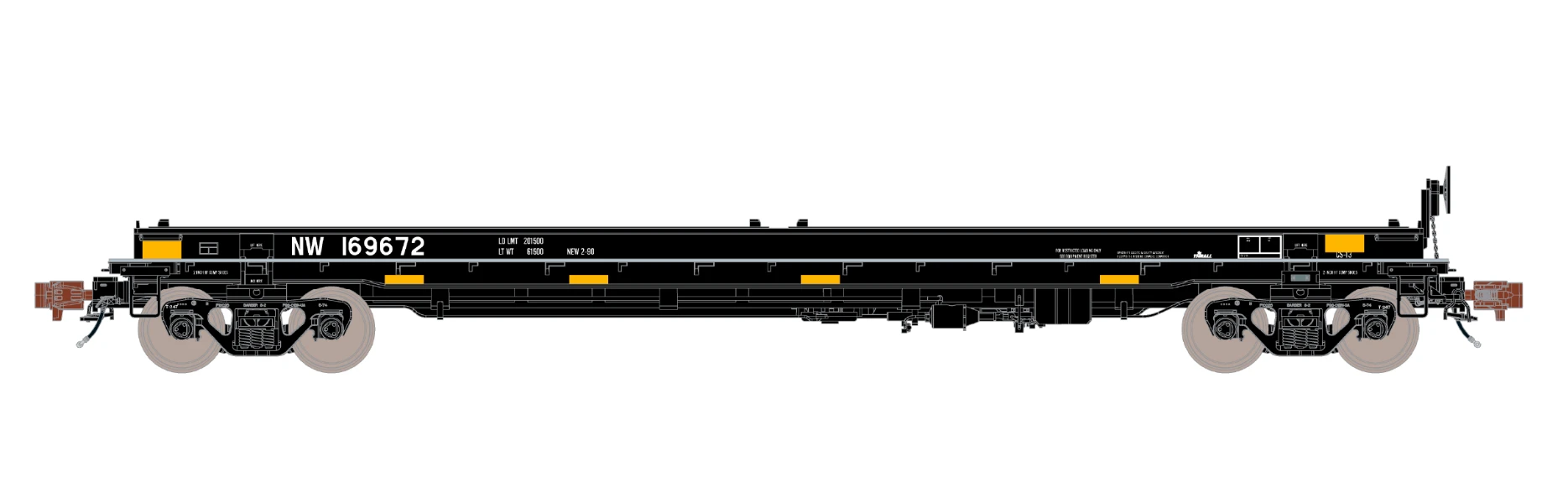 - Factory-applied end handrails, hood guides, stanchions, load divider tracks, metal grab irons, coupler cut levers, and trainline hoses with silver gladhands