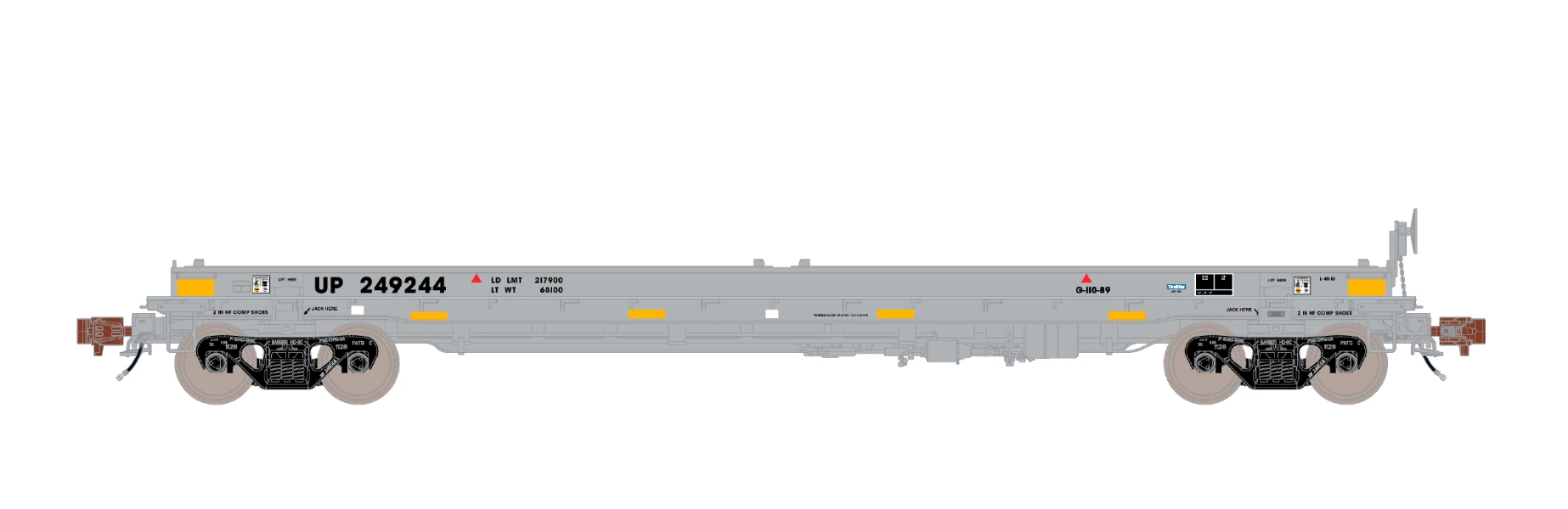- Highly-detailed Barber S-2 100-ton trucks with finely rendered raised foundry data, rotating bearing caps, side bearing detail, and separate brake beam detail
