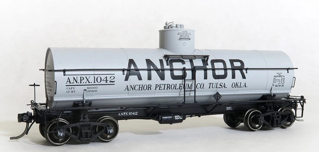 ANPX “Anchor Petroleum Company, Tulsa OKLA. 1948+” is available for US modelers that are looking to bolster their fleet of “refined product” tank cars. These insulated tank cars were likely used to haul refined oil products such as gasoline. This car is stenciled like the prototype photo on our website, representing the car as it appeared in 1948. We offer these neat tank cars in gray paint and black stenciling on the tank body. The cars are offered with six road numbers, and because each real tank car was formed by hand and had individual gallon notations stenciled on each end of the car, all six of our models have the correct gallons stenciled on each end.