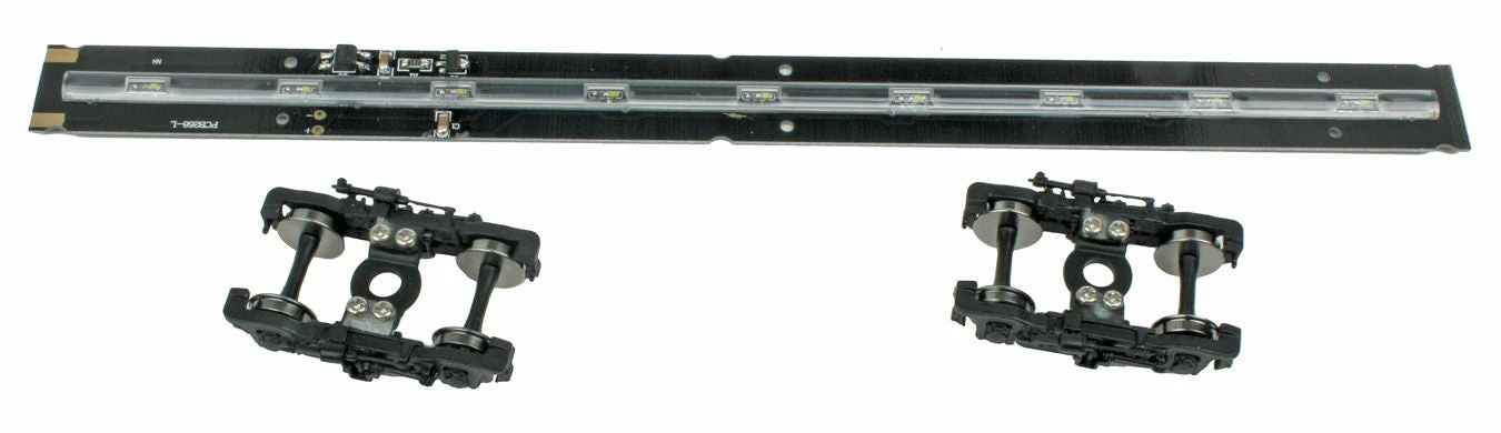 Make your WalthersMainline Budd streamline car shine with this easy to install interior lighting kit. With parts for one complete car, it includes an assembled LED light bar, die cast 41-N-11 trucks with turned metal 36″ wheels, body-mounted coupler boxes with extended swinging drawbar, bushing and cover for operation on 18″ and larger radius curves, four wipers, left and right interior electrical contacts, a mounting block and complete, illustrated instructions. Fits most cars.
